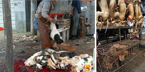 It is known that there are no penalties for the mistreatment of animals in China. This video released by PETAshows what some people are capable of in this case. The dogs are brutally slain, slashed, gutted and skinned.