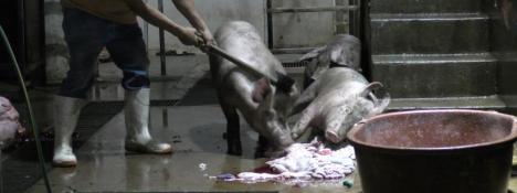 -Some pigs try to climb over other pigs to escape the impending death, while the workers kill the other pigs and begin dissecting them.