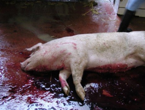 -ALL pigs are fully conscious when they are stabbed. In most slaughterhouses, pigs are killed by being stabbed in the side with several knife wounds and then bleeding to death.