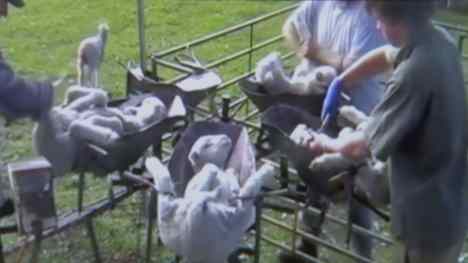 In this barbaric mulesing, the lambs are thrown on their backs with force and their legs are fixed between metal bars.