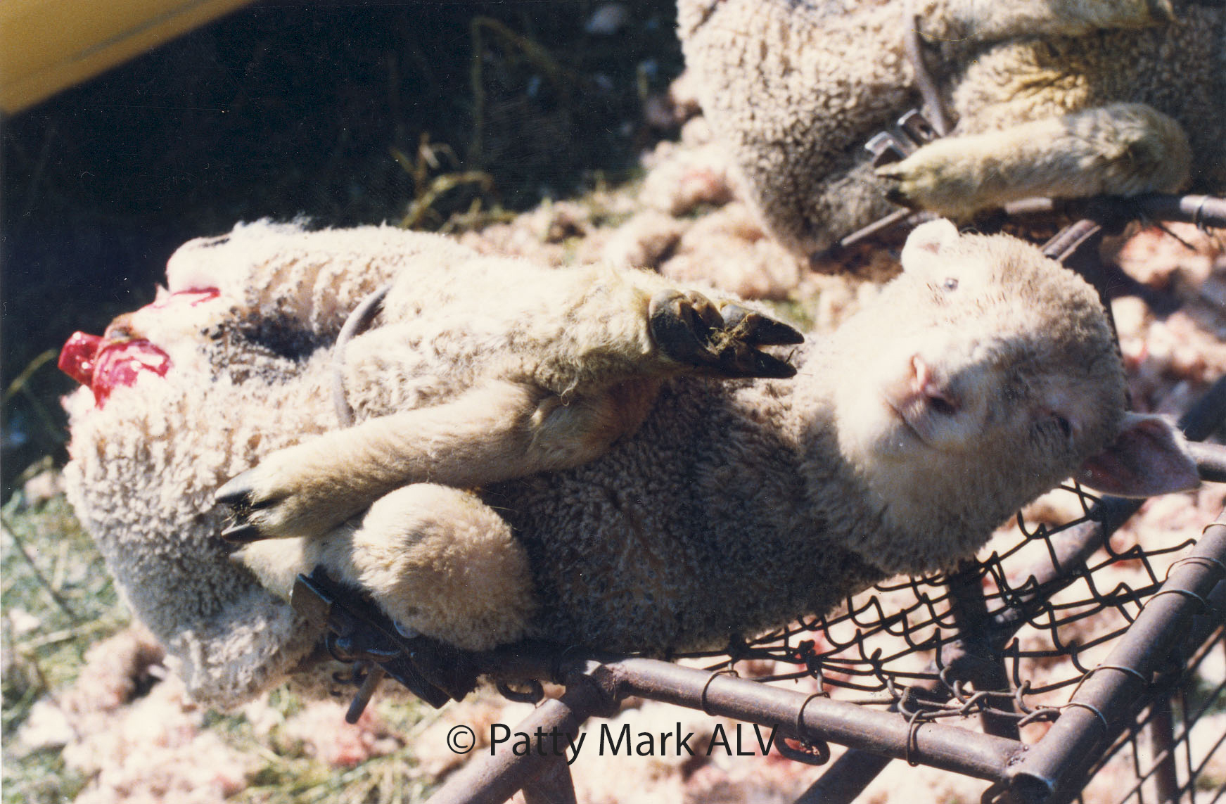 In this barbaric mulesing, the lambs are thrown on their backs with force and their legs are fixed between metal bars.