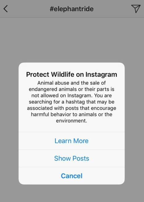 As soon as the user wants to call one of the hashtags, this warning will stop them. For example, animal welfare organizations like World Wildlife Fundand World Animal Protection and National Geographic worked with Instagram for months on a long list of hashtags – such as #tigerselfie, #elephantride, #selfiesafari – which are now closed.