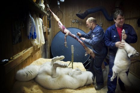 Norwegian fur farmer Per Blilie (C) skins one of his foxes at his farm in Gjovik, Norway, 28 November 2010.