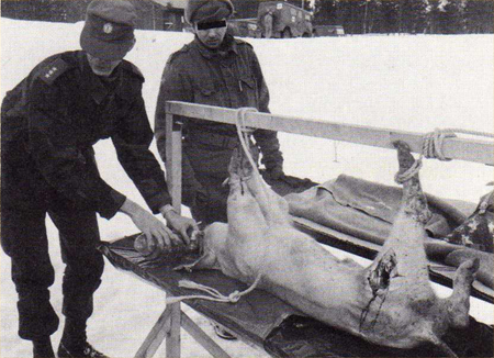 Norwegian military used pigs as living targets. Soldiers fired rifles and pistols at the hind legs and bellies of the suspended animals (picture on Sunday, March 18, 1984).