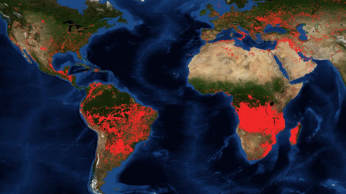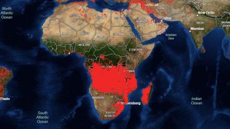 If you look at space from space, it seems that also parts of Africa are completely burning: every red dot represents a fire within the last seven days – the earth’s surface in parts of central and eastern Africa is barely recognizable.