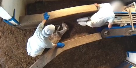 Images recorded with a camera hidden by Animal Equalia, show the wild abuse of animals in a slaughterhouse in Madrid.