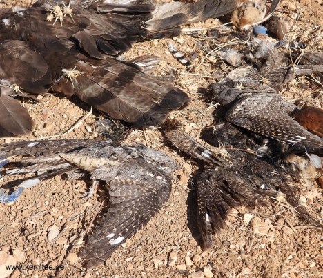 As dawn set in, we inspected the area and found dozens of dead birds – especially goat’s milkweed, scops owls and a short-toed eagle (see current photos).