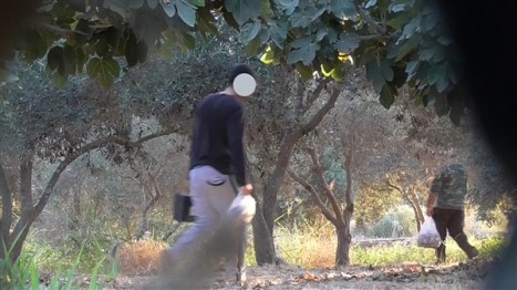 Two of the convicted trappers leaving the orchard, one with a huge bag of illegally killed birds.