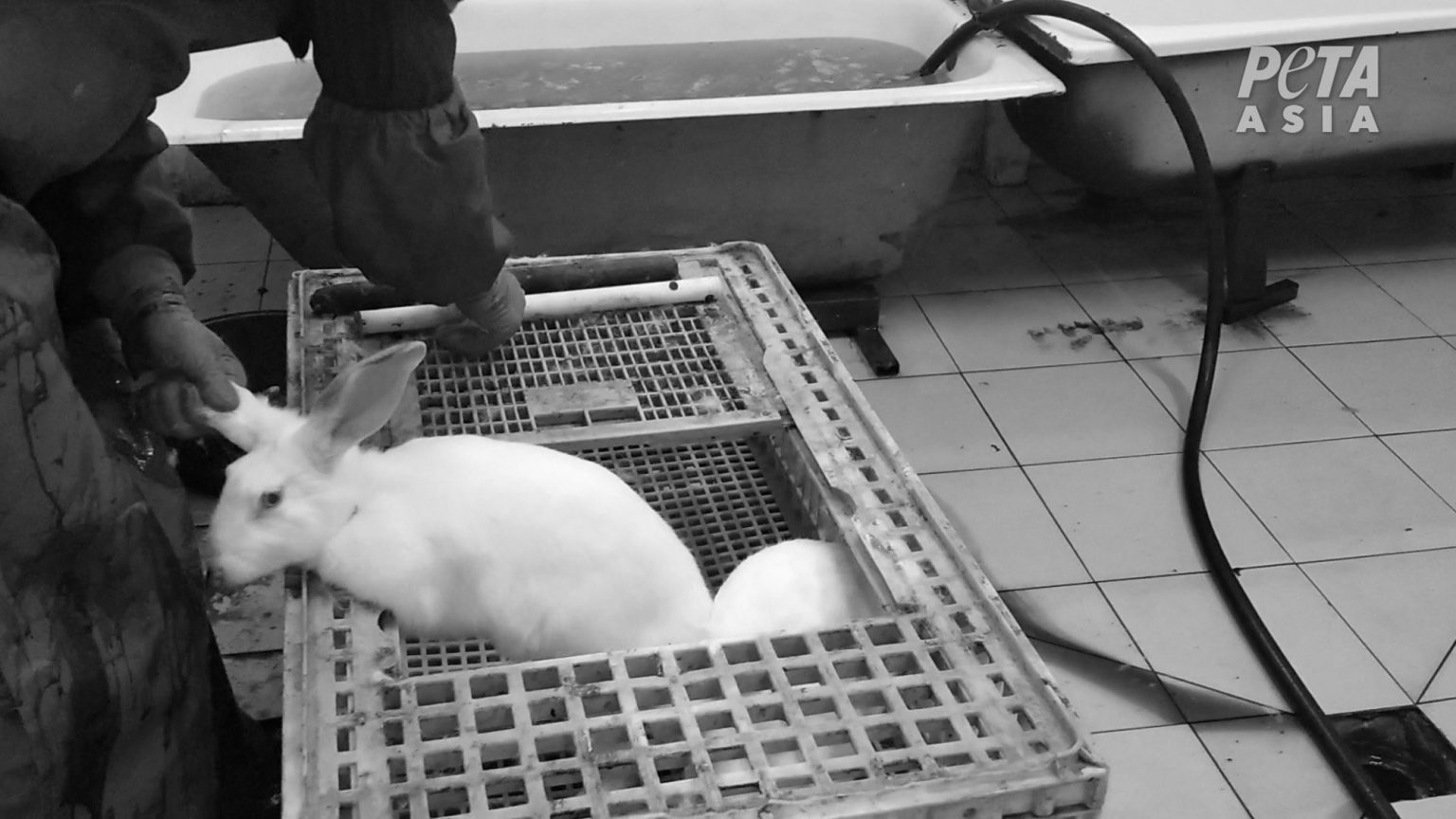 In the video, animals can be seen being kept in tiny cages when a worker takes a white rabbit and hits it on the head with a metal pipe.