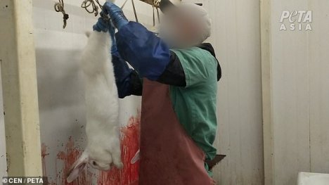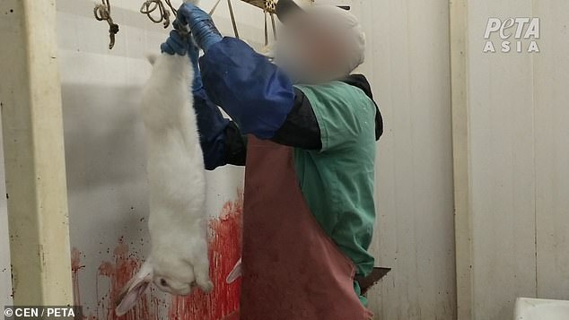 A worker can then be seen slitting a white rabbit’s neck while it was reportedly still conscious.