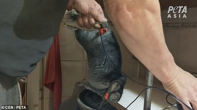 The clip then shows a chinchilla being electrocuted before its neck is snapped. Animals including foxes, minks and sables can be seen in tiny wire-mesh cages.