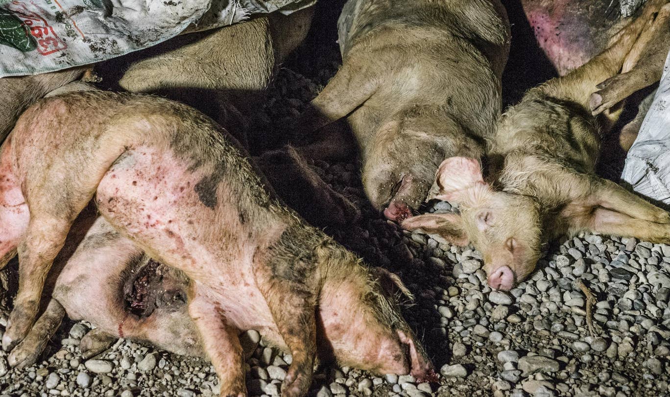 Pigs so tightly confined that they were unable to defend themselves against swarms of flies and mice among their cages.