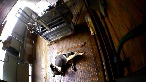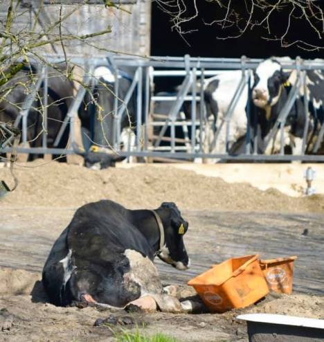 If the animal is unable to get up, the apparent slurry of liquid manure that emerges from a yellow pipe under the animal is certainly a poor surface for attempts to stand up.