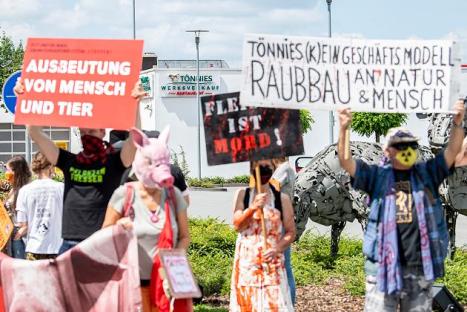 Vigorous demonstrations are now taking place in front of the Tönnies meat factory.