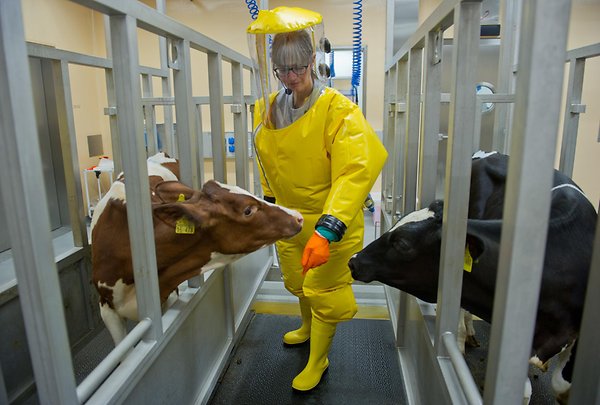 The laboratories and research stables for cattle, pigs, or goats are equipped with self-sufficient ventilation and disposal systems.