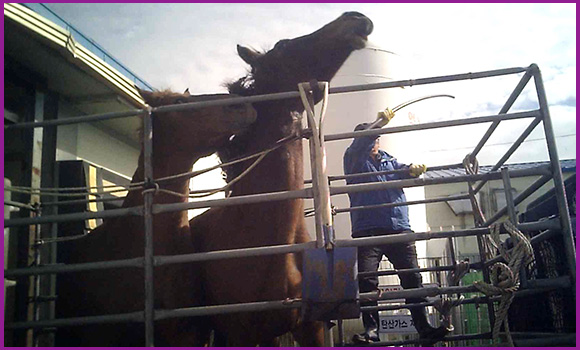 Horses are transported over long distances in cattle trucks which are completely inappropriate for them. They are brutally mistreated with sticks and electric shocks.