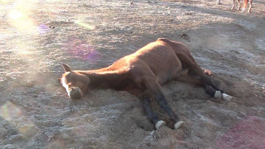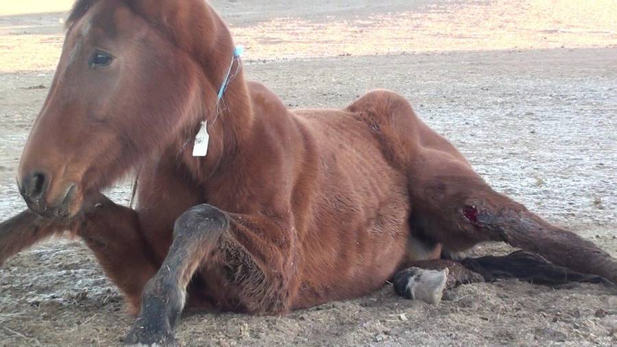 An emaciated, injured horse can no longer get on its feet (Image: confidential source).