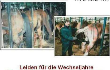 The estrogen-rich urine of pregnant mares (PMU = Pregnant Mare Urine) is a lucrative source of income for the 600 PMU animal factories.