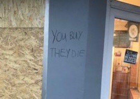Graham Fiddy, 62, found “murderer” and other vile graffiti daubed across the front of his butcher’s shop on Aylsham Road, Norwich which also had two large plate-glass windows smashed by protestors.