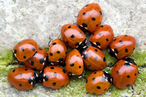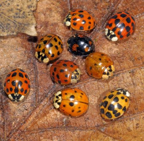 The harlequin ladybird from Asia is now more common than the native species in many regions of Germany.In autumn, the beetles sometimes unite to form large swarms in order to look for winter quarters together.Here some have settled down on the photographer’s pants for a break.– Photo: Helge May