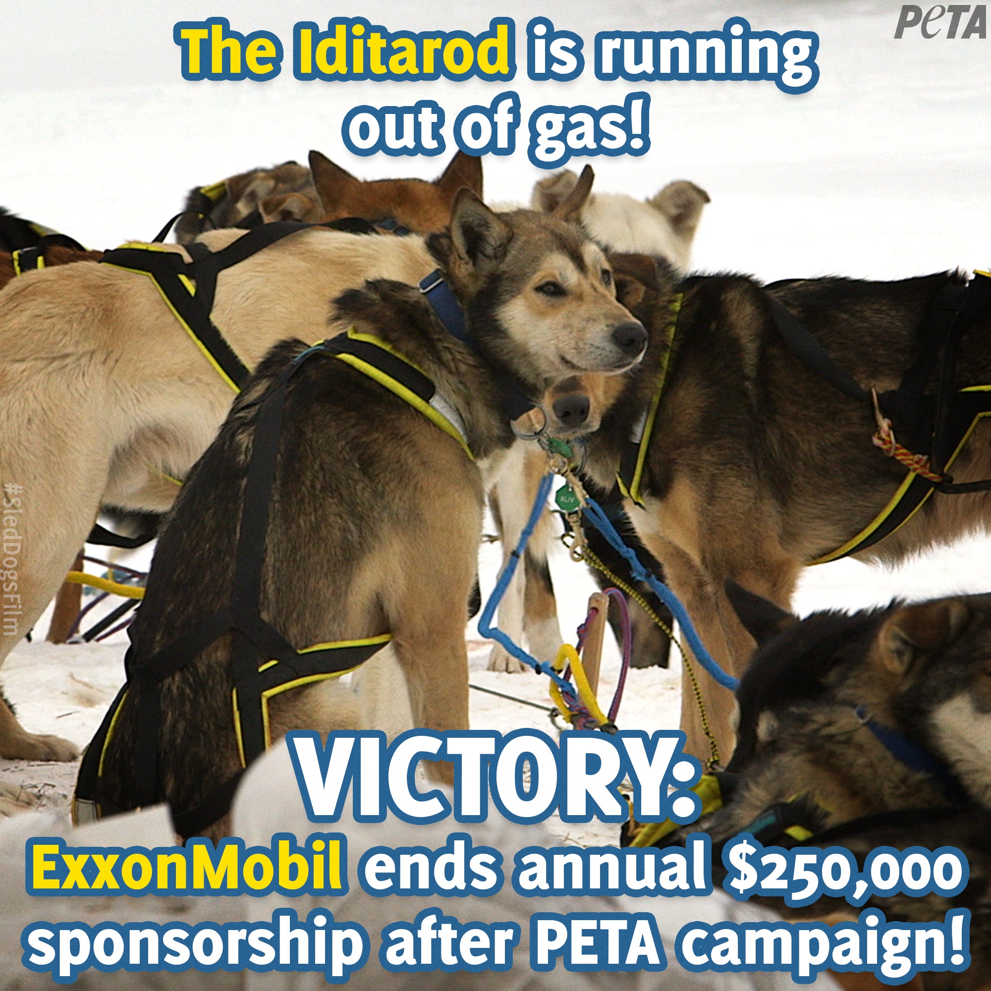 After an intense campaign by PETA USA, ExxonMobil – one of the last major sponsors of the brutal Iditarod dog sled race – has announced that it will sponsor the race for the last time in 2021.