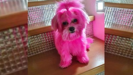 A small dog whose owner – with a broad grin – brushed it with hair dye and, after the deed was done, gave a kiss to the pink head of the “Barbie dog” for a selfie – the pictures caused horror among animal lovers.