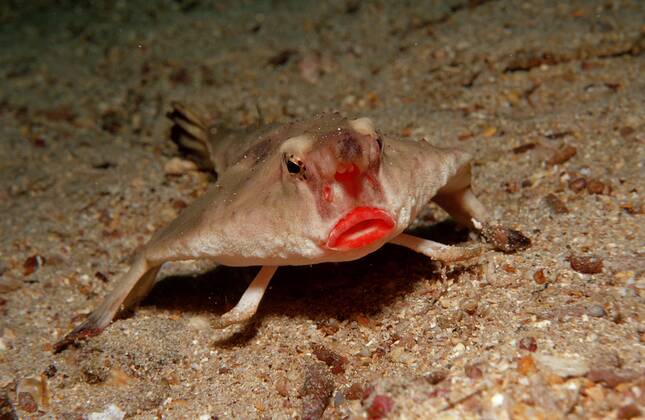 The red-lipped sea bat is an arm-fin fish with arm-like pectoral fins.