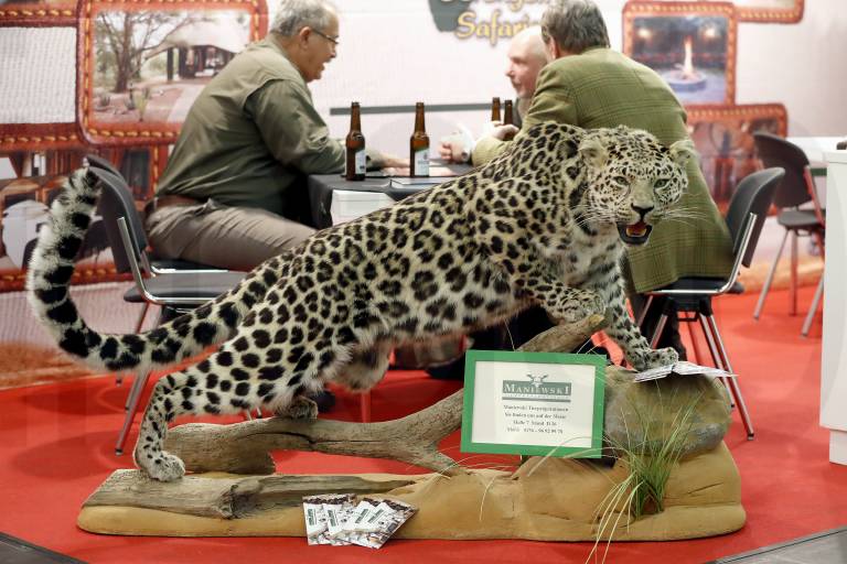 30 01 2018 Dortmund: “hunting and dog” fair- Dortmund visitors sit behind a prepared Cheetah and drink beer