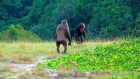 Two adult male chimpanzees in Loango National Park in Gabon.