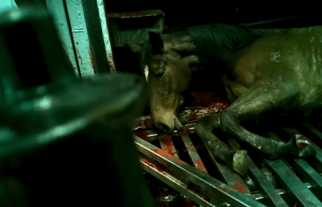 “Covertly filmed recordings of the slaughtering process in the slaughterhouse in Meramist show how horses are tormented for minutes through incorrect stunning and repeated shooting (up to five times).
