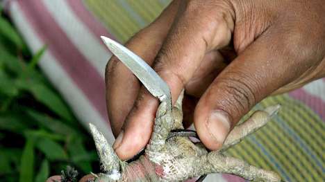 The man had already tied blades to the claws of his rooster to make it more dangerous to the opposing bird.