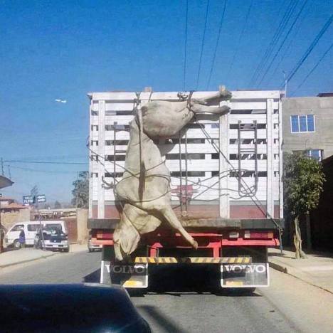 It seemed as if the animals were on their way to the slaughterhouse and there was no more space in the truck for the last cow. They hanged him outside the truck.